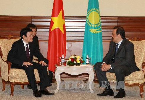 Trước đó, vào sáng nay, 11/9, Chủ tịch nước Trương Tấn Sang đã có cuộc hội kiến với Thủ tướng Kazakhstan Karim K. Massimov. Hai nhà lãnh đạo đã trao đổi và thống nhất những biện pháp tăng cường quan hệ kinh tế - thương mại giữa hai nước, như tích cực hỗ trợ xuất nhập khẩu, sớm đàm phán và ký Hiệp định thương mại tự do Việt Nam và Liên minh thuế quan Kazakhstan –Nga – Belarus, tiếp tục thống nhất và ký các hiệp định tạo cơ sở pháp lý cho hợp tác trong lĩnh vực kinh tế - thương mại. Hai bên nhất trí hợp tác lâu dài trong lĩnh vực năng lượng, đặc biệt hợp tác thăm dò và khai thác dầu khí tại Kazakhstan và Việt Nam cũng như tại nước thứ ba.