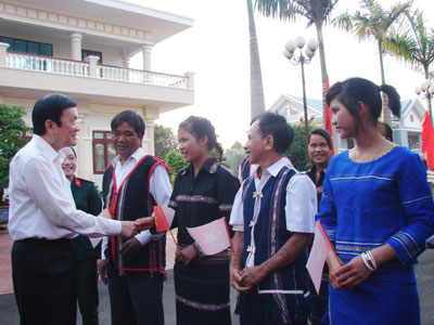 | Bà con dân tộc thiểu số tỉnh Gia Lai vui mừng đón Chủ tịch nước Trương Tấn Sang (Ảnh: qdnd.vn) |