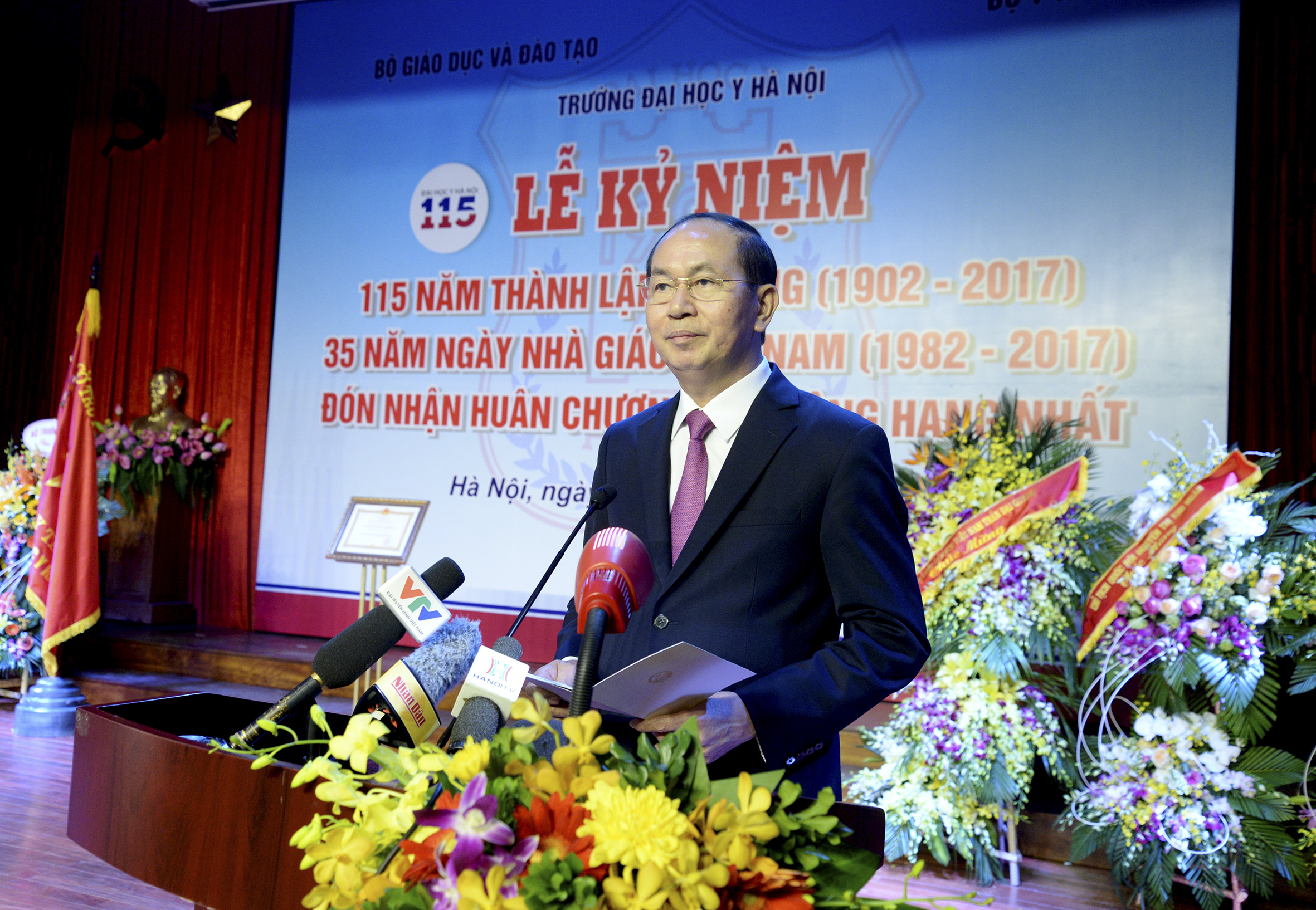 Chiều 14/11, tại Hà Nội, Đại Học Y Hà Nội tổ chức lễ kỷ niệm 115 năm thành lập (1902-2017) và đón nhận Huân chương Lao động hạng Nhất. Phát biểu tại đây, Chủ tịch nước Trần Đại Quang yêu cầu Nhà trường tiếp tục nỗ lực phấn đấu trở thành trung tâm đào tạo, nghiên cứu y khoa hàng đầu của đất nước, không chỉ đào tạo sinh viên Việt Nam mà cả sinh viên quốc tế; không chỉ triển khai, ứng dụng các thành tựu nghiên cứu ở quốc gia mà cả quốc tế; không chỉ phục vụ cộng đồng người Việt Nam mà cả cộng đồng người nước ngoài. Đồng thời, tập trung xây dựng, phát triển Trường Đại học Y Hà Nội trở thành mô hình Đại học khoa học sức khỏe trọng điểm quốc gia ngang tầm khu vực về đào tạo, nghiên cứu khoa học và chuyển giao công nghệ, là trung tâm ứng dụng và cung cấp các kỹ thuật y tế chất lượng cao trong các lĩnh vực y tế, đáp ứng yêu cầu bảo vệ, chăm sóc và nâng cao sức khỏe nhân dân.