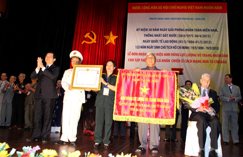 (VOV5)- Nhân kỷ niệm 38 năm ngày giải phóng miền Nam, thống nhất đất nước (30/4/1975- 30/4/2013), ngày 26/4, tại thành phố Bà Rịa, tỉnh Bà Rịa – Vũng Tàu, Chủ tịch nước Trương Tấn Sang trao tặng danh hiệu Anh hùng lực lượng vũ trang nhân dân cho tập thể và 4 cá nhân là chiến sĩ cách mạng nhà tù Côn Đảo.