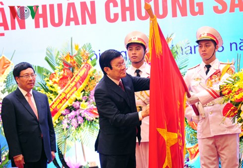 Chủ tịch nước Trương Tấn Sang gắn Huân chương Sao Vàng lên lá cờ truyền thống của ngành. Đây là lần thứ hai Bộ Ngoại giao vinh dự được nhận phần thưởng cao quý này.