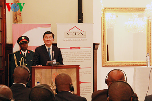Trước đó, tối 12/3, Chủ tịch nước Trương Tấn Sang có cuộc gặp gỡ nói chuyện với cán bộ nhân viên Đại sứ quán và cộng đồng người Việt Nam đang sinh sống và làm việc tại Mozambique. Chiều ngày 12/3, tại Thủ đô Maputu, Chủ tịch nước Trương Tấn Sang đến thăm và tìm hiểu về hoạt động kinh doanh tại Công ty viễn thông Movitel, liên doanh giữa Tập đoàn viễn thông quân đội Viettel với Mozambique. Trưa 12/3, tại Thủ đô Maputu, Mozambique, Chủ tịch nước Trương Tấn Sang và Tổng thống Filipe Nyusi cùng tham dự Diễn đàn doanh nghiệp Việt Nam-Mozambique.