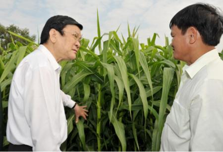Chủ tịch nước tìm hiểu năng suất giống ngô của ông Trần Văn Út. Ảnh: sggp.org.vn