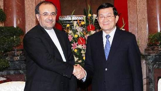 | Chủ tịch nước Trương Tấn Sang và Bộ trưởng Công nghiệp, Mỏ và Thương mại Iran Mehdi Ghazanfari (Ảnh: TTXVN) |