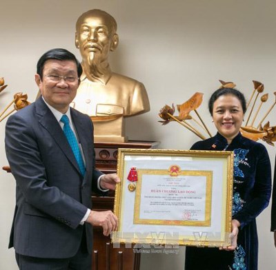 (VOV5) - Nhân dịp tham dự các hoạt động quan trọng trong khuôn khổ Đại hội đồng Liên hợp quốc lần thứ 70, Chủ tịch nước Trương Tấn Sang đã trao Huân chương Lao động hạng 2 cho Phái đoàn Đại diện thường trực Việt Nam tại Liên hiệp quốc.