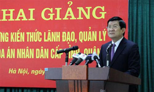 Chủ tịch nước nhấn mạnh: “Ngành Tòa án đang xây dựng và triển khai thực hiện Chương trình đào tạo kiến thức lãnh đạo, quản lý Tòa án cho lãnh đạo của Tòa án các cấp. Lớp học này là sự khởi đầu cho Chương trình đó. Tôi mong rằng các đồng chí nhận thức rõ trách nhiệm của mình, tích cực học tập và sau khi kết thúc khóa học, có trách nhiệm đóng góp ý kiến xây dựng bổ sung chương trình, hoàn thiện tài liệu, giáo trình, phương pháp giảng dạy và học tập để nhà trường rút kinh nghiệm tổ chức các khóa sau tốt hơn”.