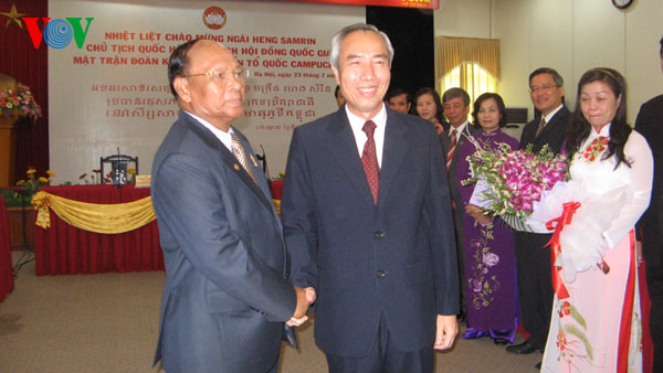 Chủ tịch Quốc hội Samdech Heng Samrin đánh giá cao mối quan hệ láng giềng tốt đẹp, hữu nghị truyền thống, hợp tác toàn diện, bền vững lâu dài giữa hai nước trong thời gian qua; bày tỏ lòng biết ơn sâu sắc về sự ủng hộ giúp đỡ to lớn, quý báu, kịp thời, có hiệu quả mà Việt Nam đã dành cho Campuchia trong sự nghiệp giải phóng dân tộc, cứu nhân dân Campuchia thoát khỏi chế độ diệt chủng cũng như trong sự nghiệp hòa hợp dân tộc, tái thiết, xây dựng, bảo vệ đất nước. Chủ tịch Ủy ban Trung ương Mặt trận Tổ quốc Việt Nam Hùynh Đảm bày tỏ tin tưởng Mặt trận Đoàn kết Phát triển Campuchia cùng với Mặt trận Tổ quốc Việt Nam tiếp tục thực hiện tốt chương trình, nội dung hai bên đã ký kết năm 2011: “Hai Mặt trận tiếp tục hợp tác để vận động các cấp, ngành, nhân dân thực hiện tốt các cam kết mà hai Chính phủ, hai Quốc hội đã thông qua. Tiếp tục phối hợp vận động nhân dân xây dựng đường biên giới hòa bình hữu nghị, trở thành đường biên giới bình yên và thể hiện tình đoàn kết hữu nghị giữa nhân dân hai nước.”/.