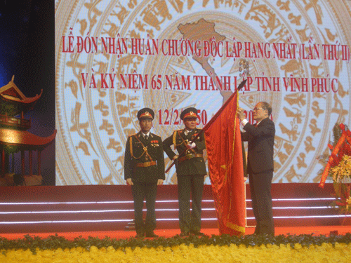 Chủ tịch Quốc hội Nguyễn Sinh Hùng trao Huân chương Độc lập hạng Nhất (lần thứ II) cho tỉnh Vĩnh Phúc (Ảnh: Đ.H)