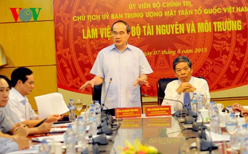 Phát biểu tại buổi làm việc với Bộ Tài nguyên và Môi trường về công tác ứng phó với biến đổi khí hậu và chương trình phối hợp thực hiện nhiệm vụ bảo vệ môi trường chiều 7/8, tại Hà Nội, Chủ tịch Ủy ban Trung ương Mặt trận Tổ quốc Việt Nam Nguyễn Thiện Nhân cho rằng với sự tham mưu của Bộ Tài nguyên và Môi trường, Chính phủ đã có những chiến lược căn bản quan trọng, kế hoạch hành động thích ứng biến đổi khí hậu. Ông Nguyễn Thiện Nhân đề nghị Bộ Tài nguyên và Môi trường cùng Ủy ban Trung ương Mặt trận Tổ quốc Việt Nam tiếp tục cụ thể hóa việc phối hợp giai đoạn 2012-2016, nhất là trên lĩnh vực tài nguyên đất, nước, biển đảo, ứng phó với biến đổi khí hậu và giám sát thực hiện pháp luật về bảo vệ môi trường, sử dụng và quản lý tài nguyên.
