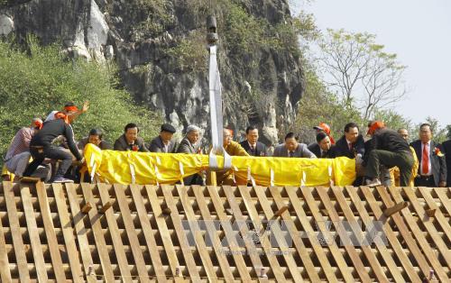 | Lễ đặt Long cốt (cất nóc) ngôi Tổ đường Chùa Hang. Ảnh: Lan Anh – TTXVN. |