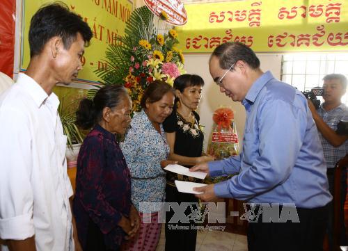 Ông Nguyễn Thiện Nhân tặng quà các hộ Khmer nghèo. Ảnh: Duy Khương – TTXVN