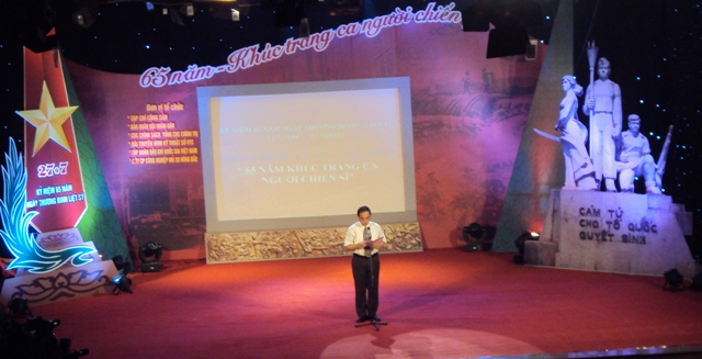 (VOV5) - Tối 21-07, tại Hà Nội diễn ra Chương trình giao lưu nghệ thuật với chủ đề " 65 năm - Khúc tráng ca người chiến sĩ". Chương trình gồm 3 phần chính: “Bản anh hùng ca chiến sĩ”, “Sức mạnh của cả cộng đồng” và “Vững vàng trên trận tuyến mới”.