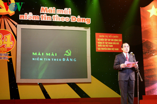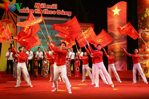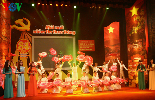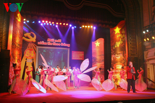 (VOV5) - Chương trình diễn ra tối 25/01, tại Nhà Hát lớn Hà Nội, để chào mừng kỷ niệm 84 năm Ngày thành lập Đảng Cộng sản Việt Nam (3/2/1930 - 3/2/2014). Nguyên Tổng Bí thư Lê Khả Phiêu, Phó Thủ tướng Nguyễn Xuân Phúc và lãnh đạo một số bộ, ban ngành Trung ương tham dự chương trình.