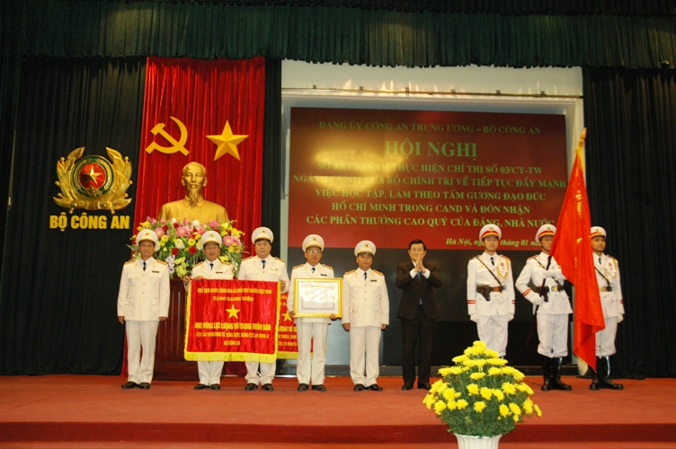 (VOV5) - Ngày 15/1, Chủ tịch nước Trương Tấn Sang dự Hội nghị sơ kết 3 năm thực hiện Chỉ thị số 03 của Bộ Chính trị về “Tiếp tục đẩy mạnh việc học tập và làm theo tấm gương đạo đức Hồ Chí Minh” của Bộ Công an, diễn ra tại Hà Nội.