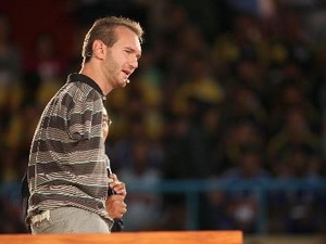 | Nick Vujicic nói chuyện với các em khuyết tật. Ảnh: TTXVN |