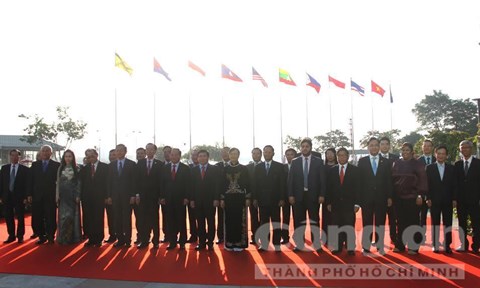 | Lãnh đạo thành phố và đại diện các nước ASEAN chụp hình lưu niệm tại lễ thượng cờ. |