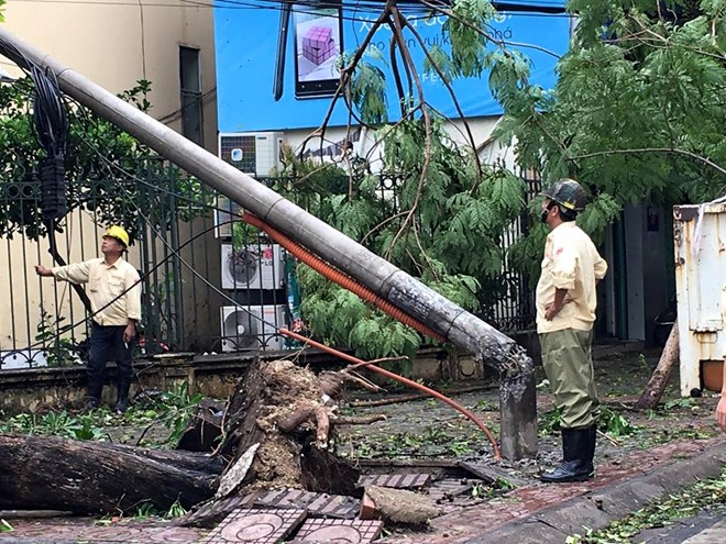 | Dọn dẹp cột điện bị ngã ở ngã ba Đào Tấn - Nguyễn Văn Ngọc (quận Ba Đình, Hà Nội). Ảnh: zing.vn |