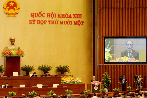 | Chủ tịch Quốc hội Nguyễn Sinh Hùng trình bày báo cáo tổng kết nhiệm kỳ Quốc hội khóa XIII (Ảnh: vovgiaothong.vn) |