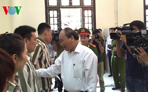 Phó Thủ tướng Nguyễn Xuân Phúc trò chuyện với các phạm nhân được đặc xá.