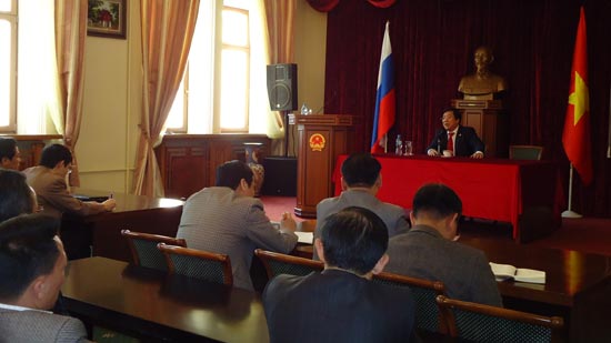 | Thứ trưởng Bộ Ngoại giao Việt Nam Nguyễn Thanh Sơn giới thiệu hoạt động hướng tới quân và dân huyện đảo Trường Sa đến bà con cộng đồng Việt Nam tại Liên bang Nga |
