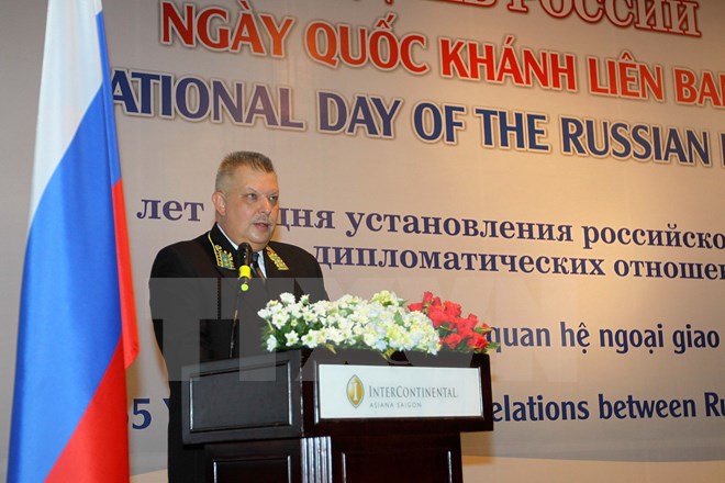 | Tổng Lãnh sự Liên bang Nga tại Thành phố Hồ Chí Minh Popov Aleksei đọc diễn văn tại lễ kỷ niệm Quốc khánh Liên bang Nga. (Ảnh: Thanh Vũ/TTXVN) |
