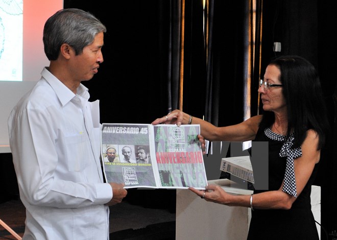 | Tổng thư ký OSPAAL Lourdes Cervantes Vasquez (phải) trao tặng một poster về quan hệ song phương cho Đại sứ Việt Nam Dương Minh. (Ảnh: TTXVN) |