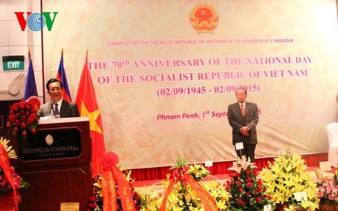Tối 1/9, tại thủ đô Phnom Penh, Đại sứ quán Việt Nam tại Vương quốc Campuchia đã tổ chức chiêu đãi trọng thể kỷ niệm 70 năm Quốc khánh nước Cộng hòa Xã hội Chủ nghĩa Việt Nam (2/9/1945 – 2/9/2015). Phát biểu tại buổi lễ, Đại sứ đặc mệnh toàn quyền Việt Nam tại Campuchia Thạch Dư cho biết trong suốt chặng đường 70 năm qua và nhất là sau gần 30 năm thực hiện công cuộc đổi mới, xây dựng và phát triển đất nước, Việt Nam đã giành được nhiều thành tựu to lớn về mọi mặt. Việt Nam luôn kiên trì, tích cực triển khai thực hiện đường lối đối ngoại độc lập, tự chủ và chính sách đối ngoại mở rộng, tích cực hội nhập toàn diện với khu vực và quốc tế trên tinh thần "Việt Nam là bạn, là đối tác tin cậy và có trách nhiệm”. Tham dự buổi lễ, Phó Thủ tướng Campuchia Hor Namhong đánh giá cao quan hệ hữu nghị và hợp tác giữa Việt Nam và Campuchia và bày tỏ sự khâm phục đối với sự phát triển của Việt Nam.