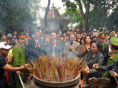 Sau khi nghe bà Nguyễn Thị Kim Hải- Chủ tịch Hội Di sản tỉnh, Trưởng bộ phận Thường trực Ban chỉ đạo hồ sơ di sản, nguyên Phó chủ tịch UBND tỉnh, giới thiệu một số thông tin liên quan đến tín ngưỡng thờ cúng Hùng Vương tại Phú Thọ, Chương trình Giỗ Tổ Hùng Vương-Lễ hội Đền Hùng năm nay; đoàn đã lên thăm, dâng hương tưởng niệm các Vua Hùng tại các đền thờ trên núi Nghĩa Lĩnh thuộc Khu DTLS Đền Hùng.