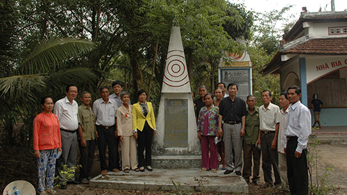 | Đoàn công tác chụp ảnh bên bia tưởng niệm Đài Nam bộ kháng chiến |