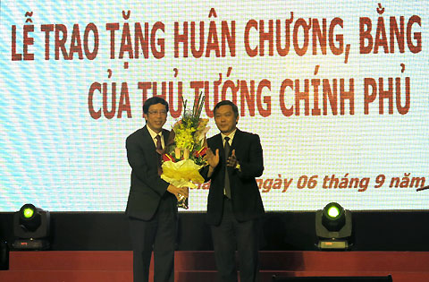 | Thứ trưởng Bộ Thông tin truyền thông Trần Đức Lai trao Bằng khen của Thủ tướng Chính phủ và hoa cho Tổng Giám đốc VOV Nguyễn Đăng Tiến |