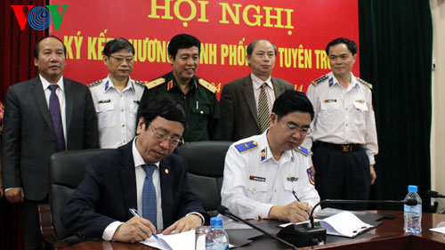 (VOV5)- Chiều nay, tại Hà Nội, Đài Tiếng nói Việt Nam và Bộ Tư lệnh Cảnh sát biển Việt Nam đã ký kết chương trình phối hợp nhằm tăng cường thông tin, tuyên truyền về biển và hải đảo, góp phần phổ biến rộng rãi, kịp thời đến các cấp, các ngành, tầng lớp nhân dân, cán bộ, chiến sỹ trong lực lượng vũ trang về nhiệm vụ Quân sự-Quốc phòng của Đảng và Nhà nước cũng như các hoạt động của lực lượng Cánh sát biển.
