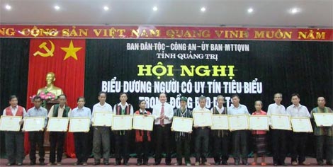 | Ông Nguyễn Quân Chính, Phó Chủ tịch UBND tỉnh Quảng Trị tặng bằng khen cho các già làng, trưởng bản, người có uy tín trong đồng bào dân tộc thiểu số. |