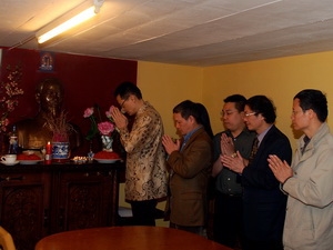 Các cán bộ Phái đoàn Việt Nam dâng hương Giỗ Tổ. (Ảnh: Tố Uyên/Vietnam+)