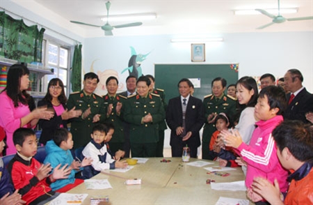 | Đại tướng Ngô Xuân Lịch thăm lớp học tại Làng Hữu nghị Việt Nam (Ảnh: qdnd.vn) |