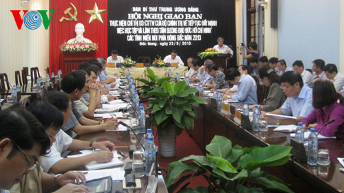 (VOV5) - Ngày 23/9, tại thành phố Bắc Giang, Ban Bí thư Trung ương Đảng Cộng sản Việt Nam tổ chức hội nghị giao ban các tỉnh miền núi phía Đông Bắc về việc thực hiện Chỉ thị 03 của Bộ Chính trị về tiếp tục đẩy mạnh học tập và làm theo tấm gương đạo đức Hồ Chí Minh.