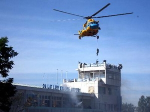 | Tình huống lực lượng chức năng dùng trực thăng xâm nhập đài chỉ huy để giải cứu con tin. (Ảnh: TTXVN) |