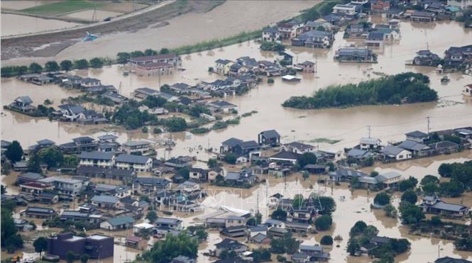 Những ngôi nhà chìm trong nước lũ do mưa lớn ở Hitoyoshi, quận Kumamoto, phía Nam Kyushu, Nhật Bản ngày 4/7/2020. Ảnh: AFP/TTXVN |