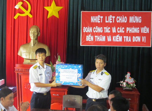 | Tặng quà cán bộ chiến sỹ Trạm Rada 570. Ảnh: Thanh Tú |