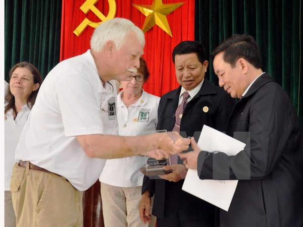 | Đại diện Tổ chức Cựu chiến binh Mỹ tham chiến ở Việt Nam trao hỗ sơ thông tin liệt sỹ Việt Nam cho đại diện Cựu chiến binh Việt Nam tỉnh Quảng Nam. (Ảnh: TTXVN) |