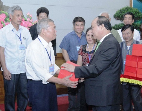 | Phó Thủ tướng Nguyễn Xuân Phúc tặng quà các đại biểu người có uy tín tiêu biểu tỉnh Lạng Sơn. Ảnh: VGP/Lê Sơn |
