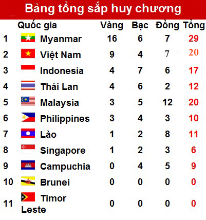 Tính đến thời điểm này, dẫn đầu trên bảng tổng sắp huy chương vẫn là đoàn chủ nhà Myanmar với 18 HCV, 7 HCB và 9 HCĐ. Xếp thứ hai là Việt Nam với 9 HCV, 4 HCB và 7 HCĐ. Thái Lan và Indonesia lần lượt đứng ở vị trí thứ 3 và 4 trong khi Đông Timor là đoàn duy nhất chưa có huy chương nào./.
