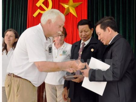 | Đại diện tổ chức Cựu chiến binh Mỹ tham chiến tại Việt Nam trao hồ sơ thông tin liệt sỹ Việt Nam cho đại diện Hội Cựu chiến binh Việt Nam tỉnh Quảng Nam. (Ảnh: Đỗ Trưởng-TTXVN) |