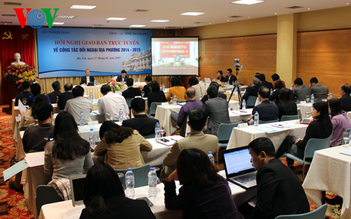 Sáng nay tại Hà Nội, Bộ Ngoại giao Việt Nam tổ chức hội nghị giao ban trực tuyến về công tác đối ngoại tại các địa phương, nhằm đánh giá kết quả các hoạt động đối ngoại địa phương trong năm 2014 và triển khai hoạt động đối ngoại quan trọng của đất nước trong năm 2015. Năm 2014, công tác đối ngoại của Việt Nam đạt được nhiều thành tựu to lớn, góp phần quan trọng vào việc duy trì môi trường hòa bình, ổn định, giữ vững độc lập, chủ quyền và toàn vẹn lãnh thổ. Việt Nam cũng tranh thủ được nguồn lực bên ngoài để phát triển đất nước, đưa quan hệ giữa Việt Nam với các đối tác đi vào chiều sâu và ngày càng có hiệu quả. Những thành công này có phần đóng góp không nhỏ của hoạt động đối ngoại tại các địa phương.