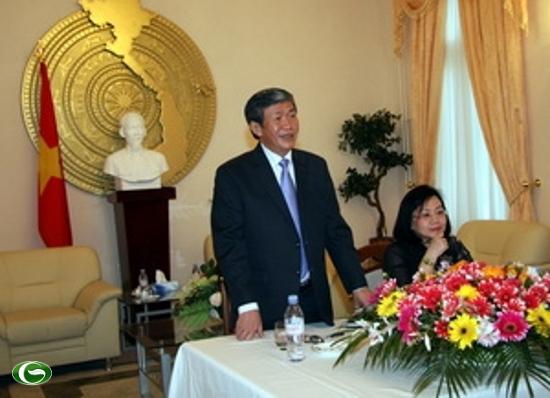| Bí thư Trung ương Đảng Đinh Thế Huynh phát biểu với cán bộ Đại sứ quán và đại diện cộng đồng |