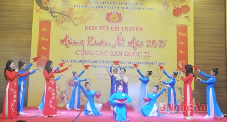 Tối 6/2, tại thành phố Vinh, UBND tỉnh Nghệ An tổ chức chương trình “Đón Tết cổ truyền Mừng Xuân Ất Mùi 2015 cùng các bạn quốc tế”. Đây là chương trình dành cho những người nước ngoài đã có đóng góp vào công cuộc phát triển kinh tế - xã hội của tỉnh Nghệ An. Lãnh đạo tỉnh Nghệ An đánh giá cao các chuyên gia, các nhà đầu tư đã đến Nghệ An làm việc, cùng chung tay góp sức để xây dựng Nghệ An phát triển và mong muốn đón nhận nhiều hơn nữa sự hợp tác tích cực, hiệu quả từ các chuyên gia, nhà đầu tư nước ngoài.