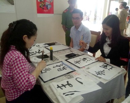 | Các bạn trẻ Việt Nam trải nghiệm viết thư pháp Nhật Bản. (Ảnh minh họa: Đồng Thúy/TTXVN) |
