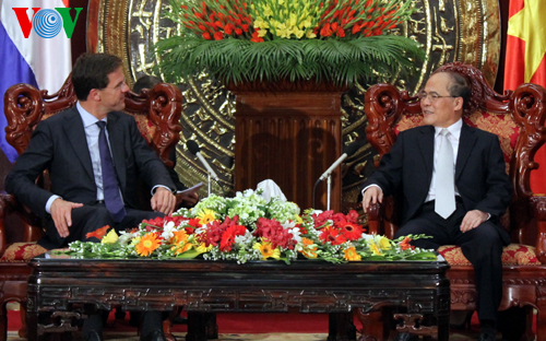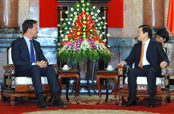 Chiều 16/6, tại Hà Nội, Chủ tịch nước Trương Tấn Sang tiếp Thủ tướng Mark Rutte đến chào xã giao nhân chuyến thăm chính thức Việt Nam. Chủ tịch nước Trương Tấn Sang đề nghị hai bên tiếp tục tăng cường trao đổi đoàn và tiếp xúc cấp cao, hợp tác tích cực tại các diễn đàn đa phương; cám ơn và mong muốn Hà Lan tiếp tục ủng hộ Việt Nam tăng cường quan hệ toàn diện với EU. Chủ tịch nước khẳng định Việt Nam hoan nghênh và tạo mọi điều kiện thuận lợi cho các doanh nghiệp Hà Lan kinh doanh, đầu tư lâu dài, hiệu quả tại Việt Nam.