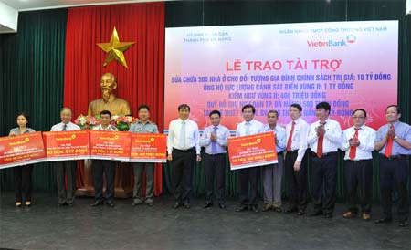 (VOV5) - Ngày 26/6, tại thành phố Đà Nẵng, Ngân hàng Thương mại cổ phần Công thương Việt Nam (VietinBank) trao số tiền tài trợ 10 tỷ đồng cho chính quyền địa phương để sửa chữa 500 căn nhà ở cho đối tượng chính sách trên địa bàn thành phố.