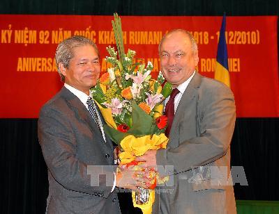 | Ông Tống Văn Nga, Chủ tịch Hội Hữu nghị Việt Nam – Rumani tặng hoa chúc mừng ông Dumitru Olaru, Đại sứ Rumani tại Việt Nam nhân dịp 92 năm Quốc khánh Rumani. Ảnh: Doãn Tấn/TTXVN |