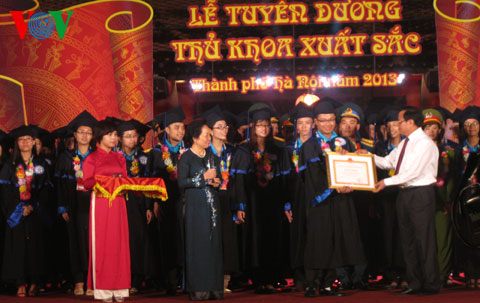 (VOV5) - Tối 25/8, tại Hà Nội, Ủy ban Nhân dân, Thành đoàn thành phố Hà Nội phối hợp tổ chức chương trình Gặp mặt 206 Thủ khoa và tuyên dương 123 Thủ khoa xuất sắc tốt nghiệp các trường đại học và 34 thủ khoa đầu vào trên địa bàn Thành phố năm 2013.